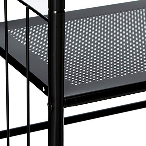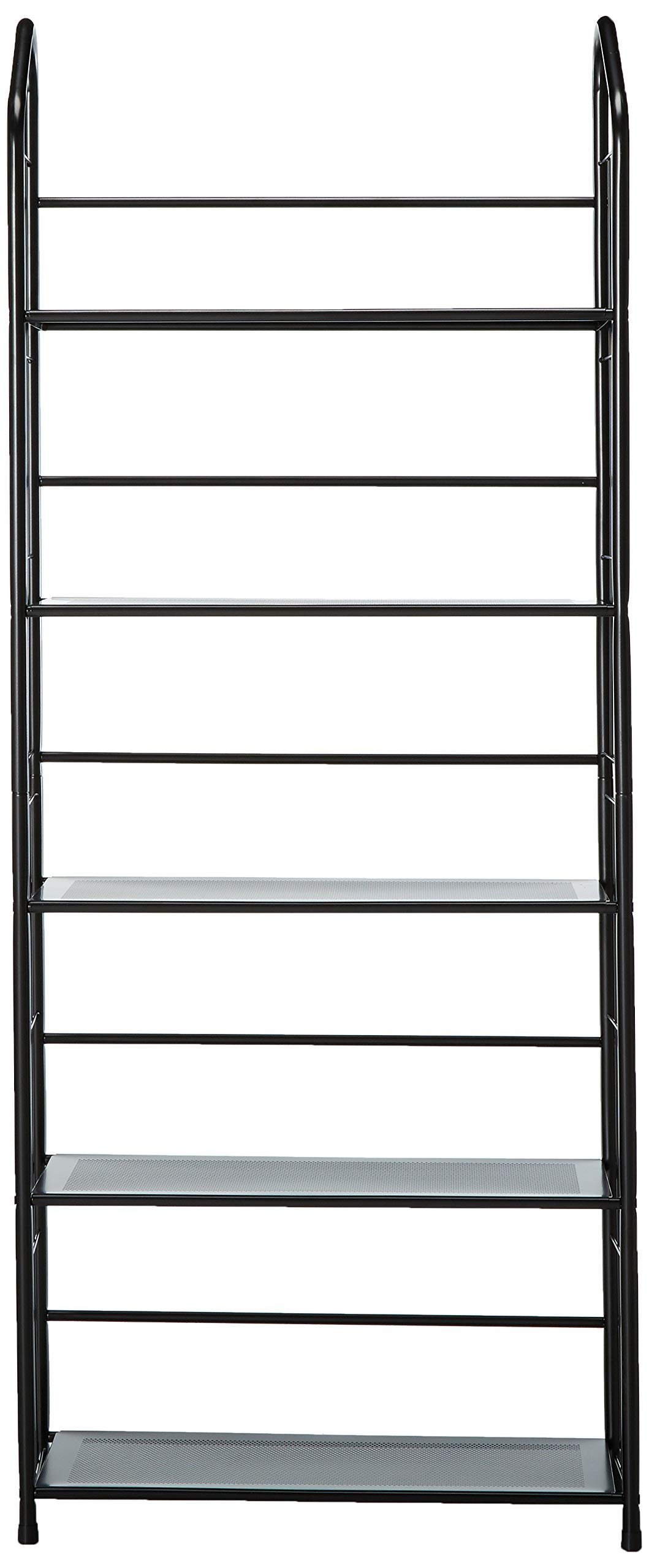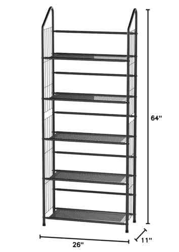 This contemporary bookshelf provides ample shelf space on five tiered shelves. Made of black painted metal, it offers added strength with bars along the sides and back. The 11-inch deep shelves are spaced about 1 foot apart, creating a versatile unit that is strong yet lightweight for easy mobility. Measures 26″W X 11″D x 64″H.