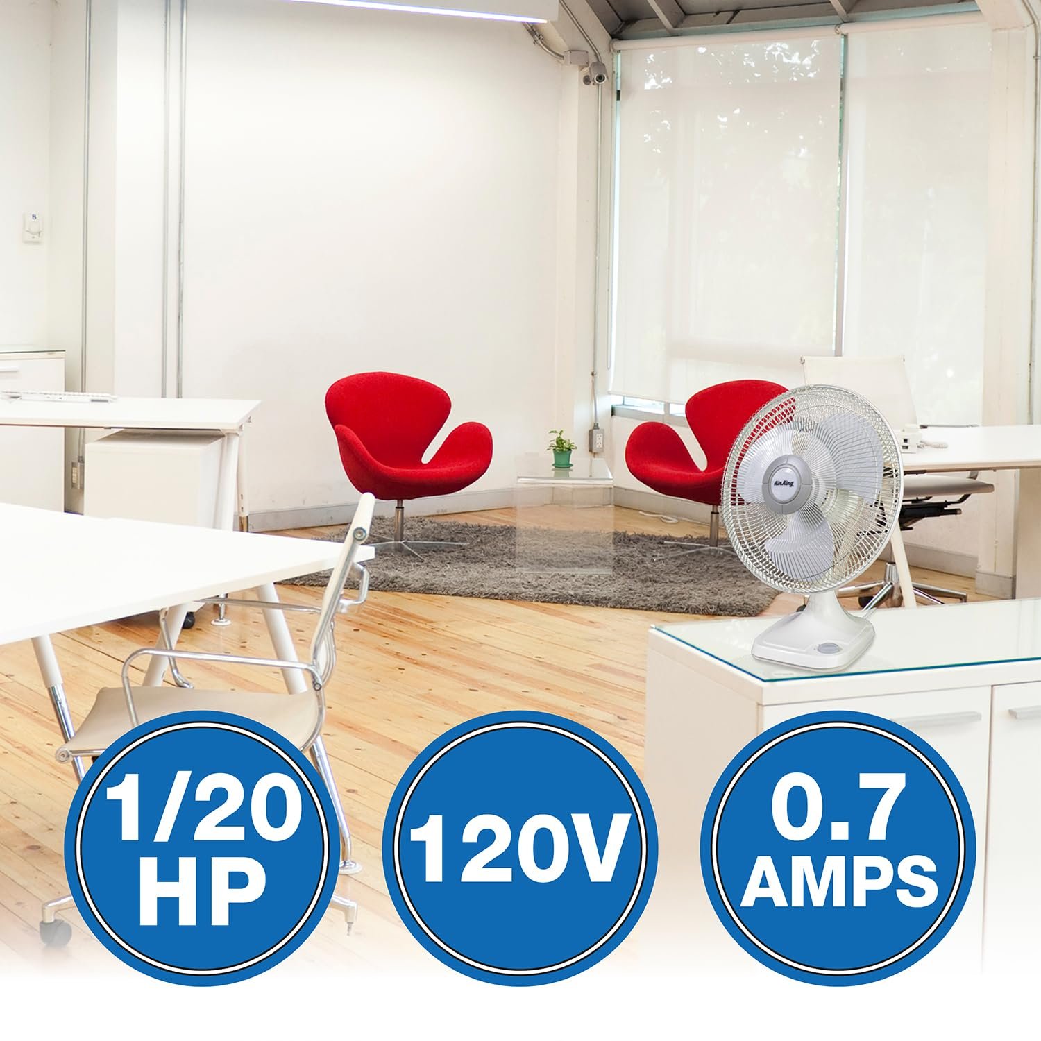 Table fans provide an excellent solution to sparse floor space. The Air King 9106 oscillating table fan turns 90°, covers a wide range of angles, and can be locked in a fixed position. Powered by a 120-volt motor, it delivers up to 1710 CFM and 1545 RPM at its highest speed. Constructed with powder-coated steel front grill and impact-resistant plastic rear grill, this neutral white fan is ideal for quiet operation environments like offices, hospitals, and schools.
