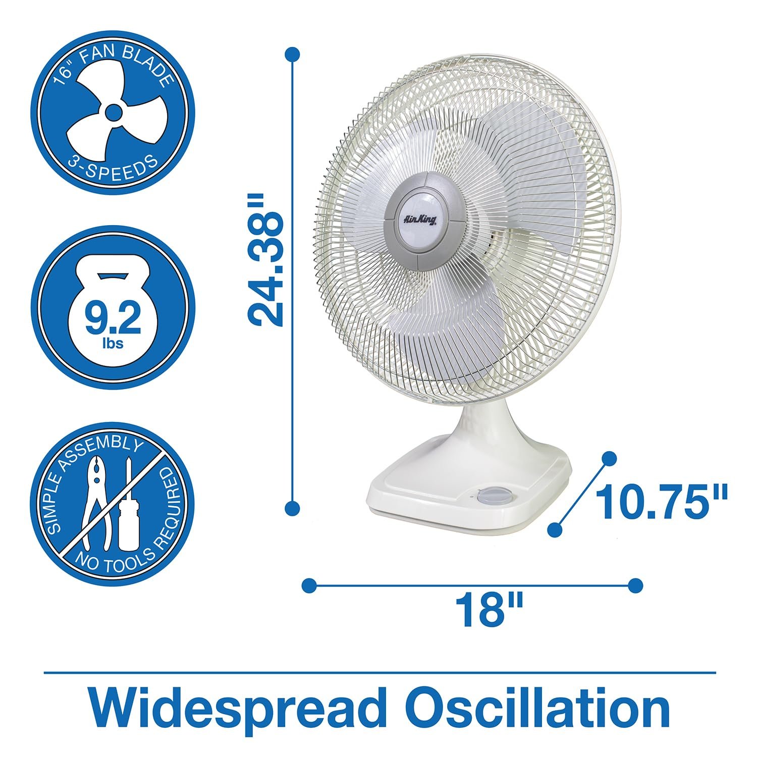 - Design: 16-inch 3-speed oscillating table fan