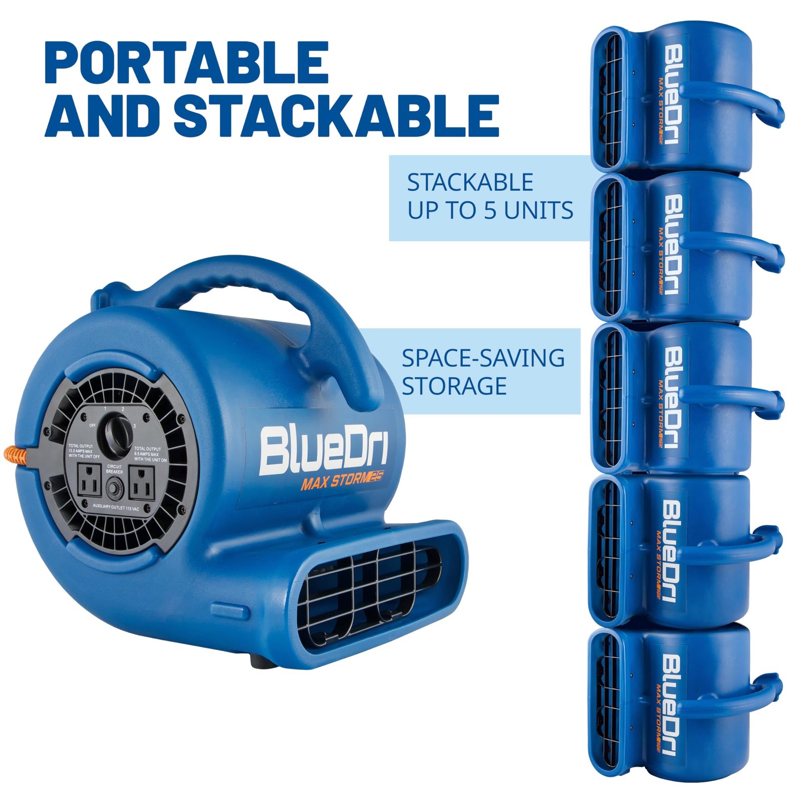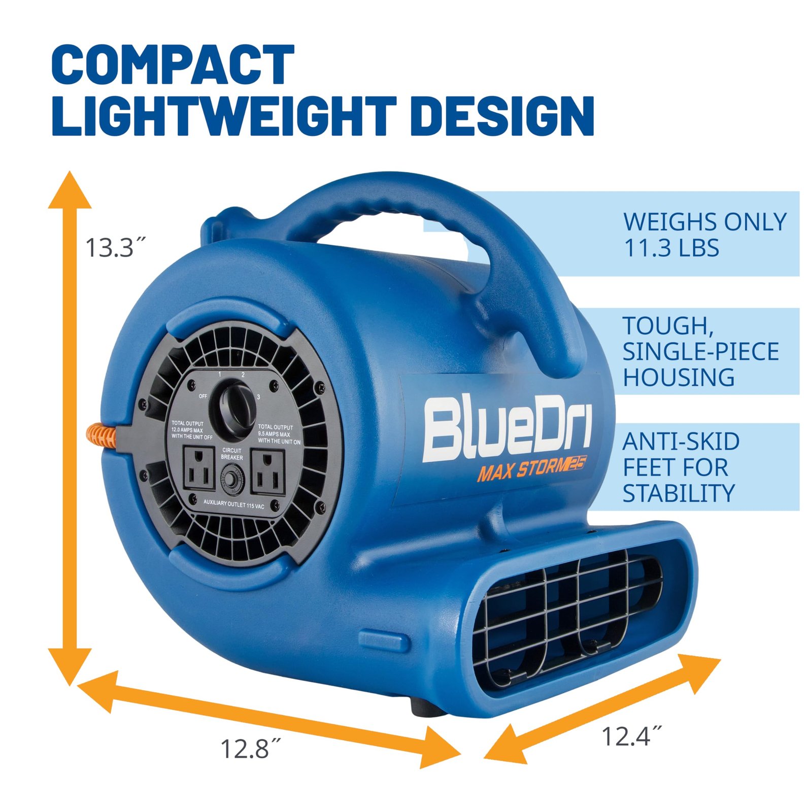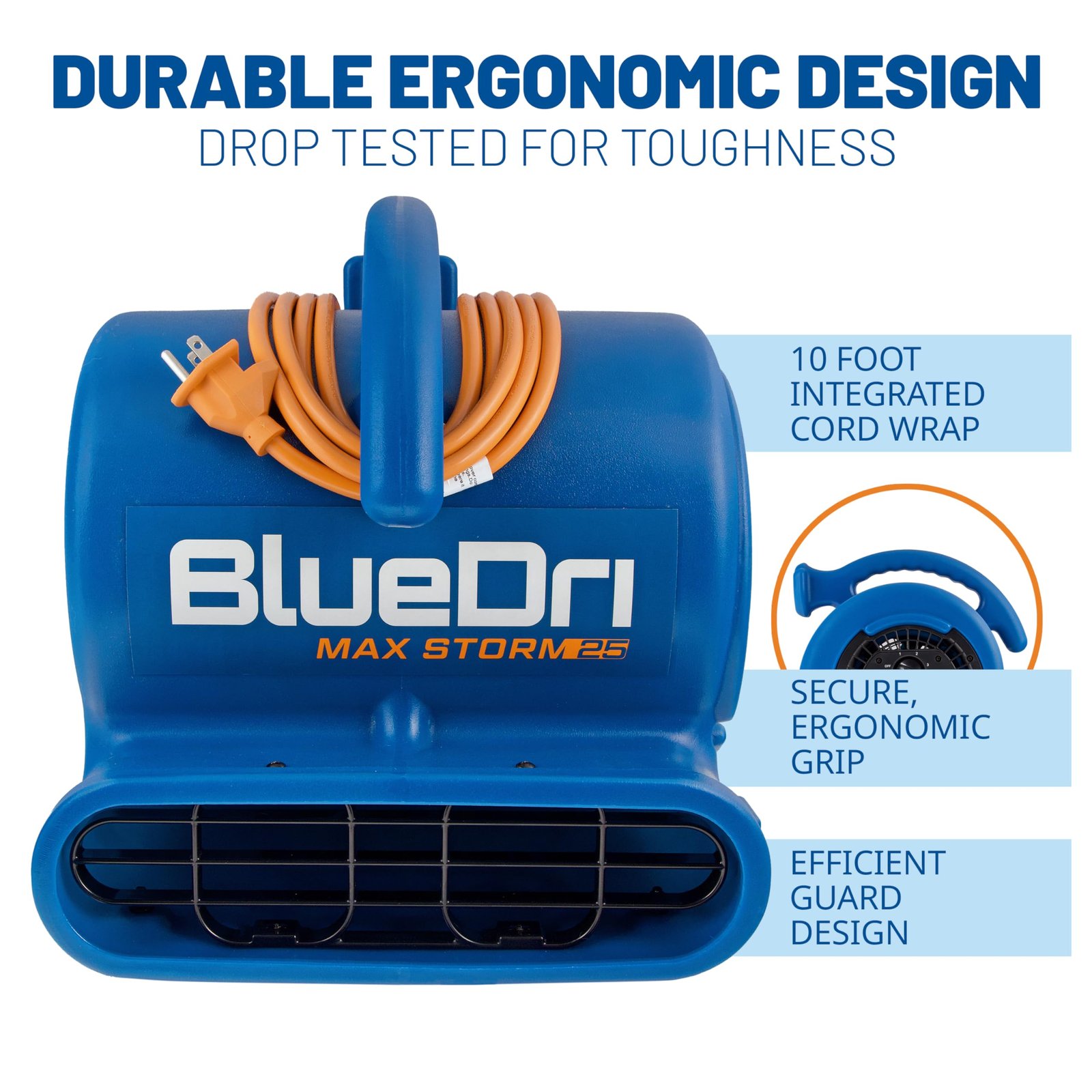 Introducing the ultimate solution for water damage restoration and home use – the BlueDri Max Storm 25 Air Mover Blower Fan. With a robust 1/4 HP motor producing 900 CFM of airflow, this fan ensures efficient and quick drying results. Featuring three adjustable angles, GFCI port for daisy chaining, and durable polyethylene construction, it is perfect for professionals and homeowners alike.