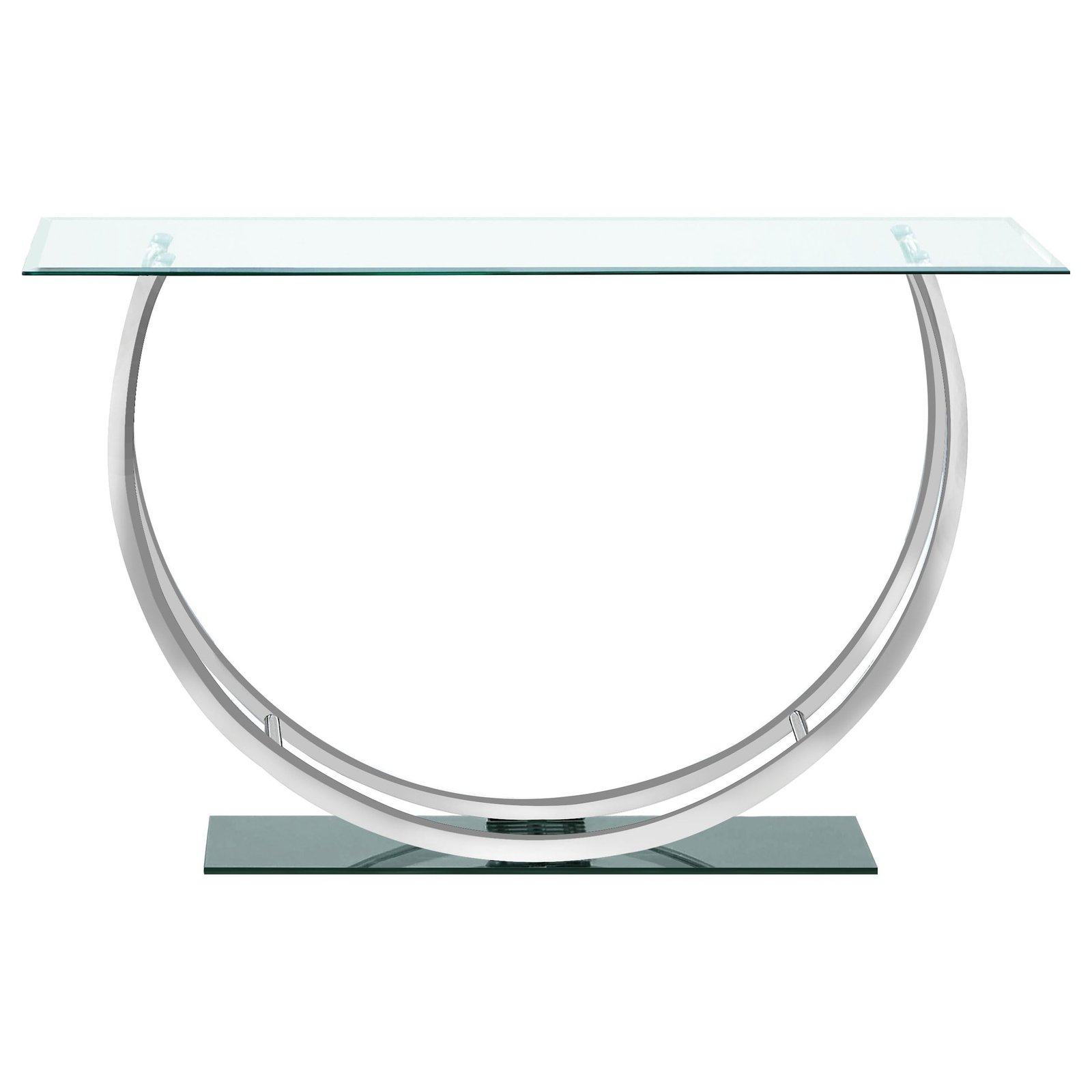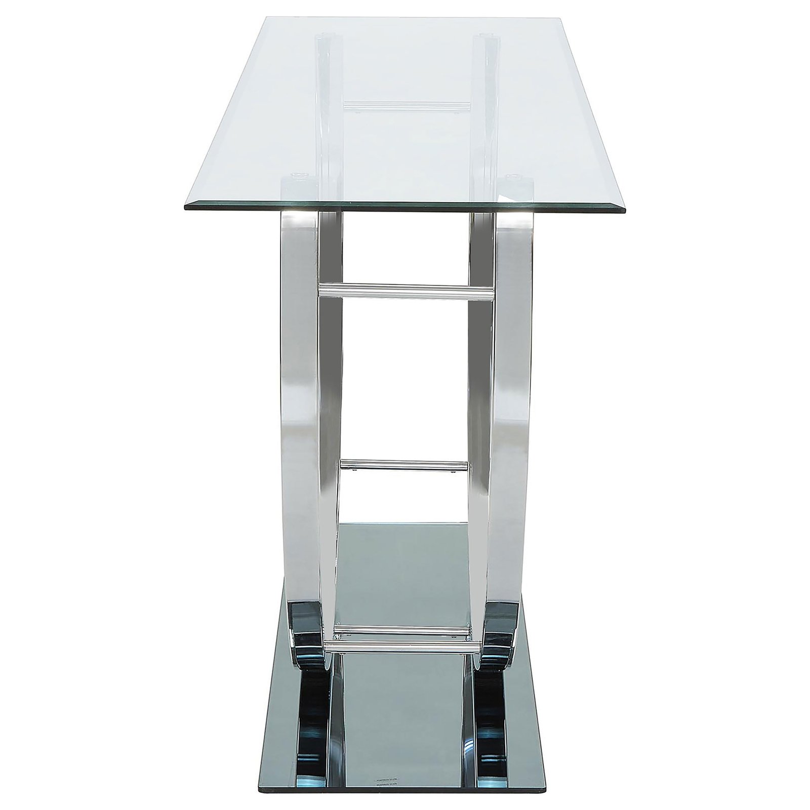 A striking balance of elegance and functionality, this contemporary table enhances any space with its sleek silhouette and refined details. The 48-inch console tabletop provides ample room for display, supported by a sturdy metal construction with a radiant chrome finish that exudes modern sophistication. A glass top adds an airy, open feel, while the mirrored base reflects light beautifully to brighten the room. Designed for small spaces, this modern entryway table also works seamlessly as a living room console table or a stylish table behind sofas, offering both style and convenience.