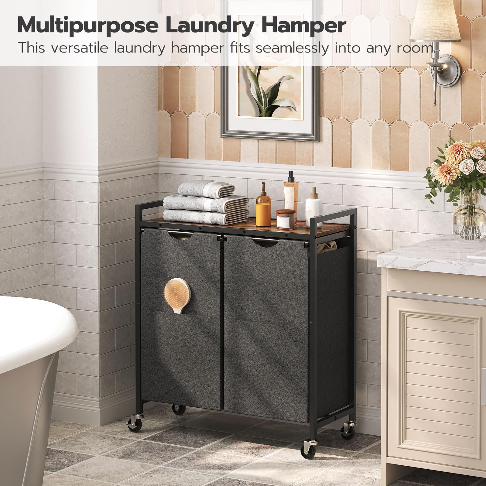 Color: Rustic Brown, Black Material: Oxford Fabric, Particleboard, Metal Product Size: 27.6″L x 11.8″W x 30.3″H Size per Bag: 11.8″Lx 11.8″W x 21.7″H Package Contents: 1 x 2-Bag Laundry Sorter; 1 x Accessory Kit; 1 x Instructions;