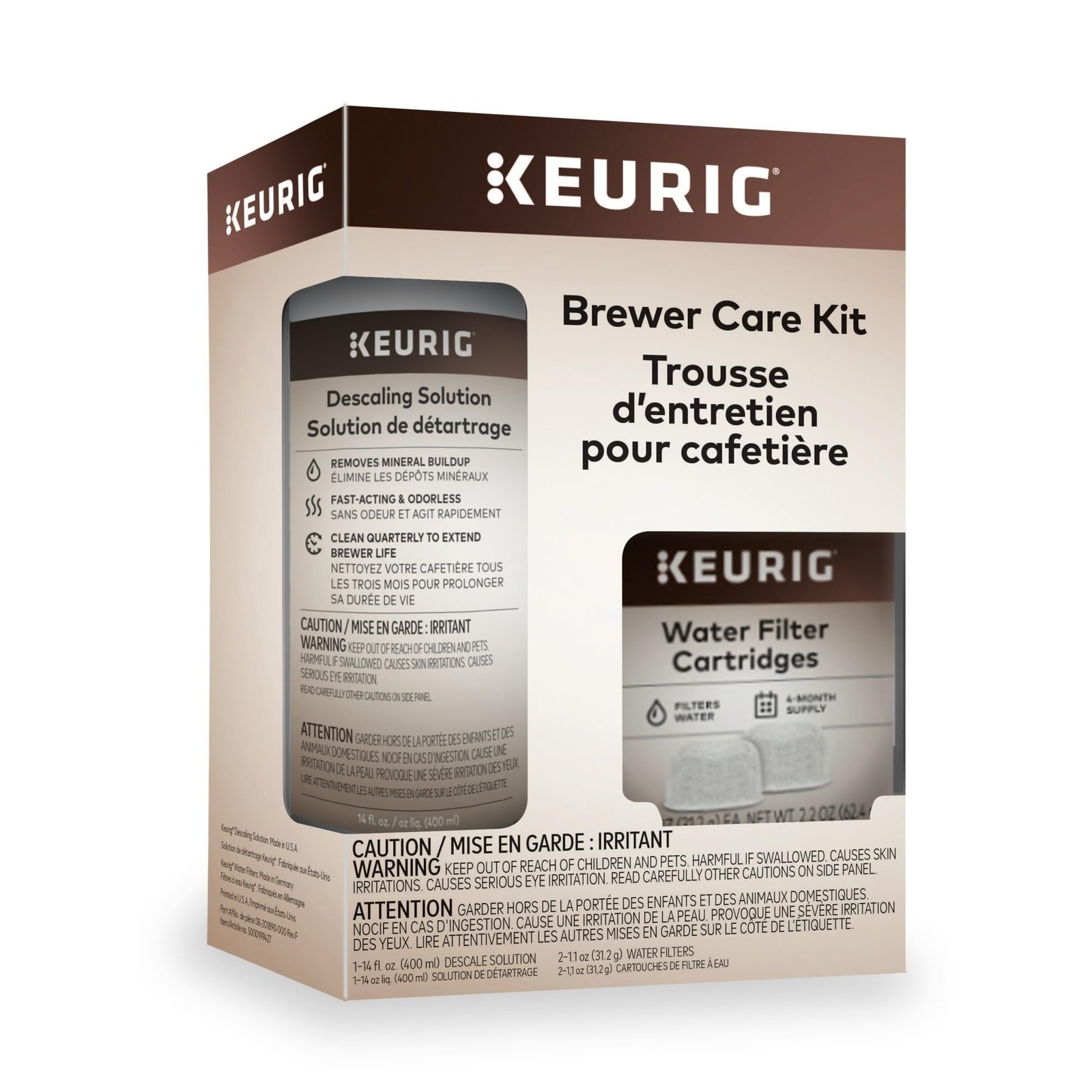 Keep your Keurig brewer working at peak performance with this Brewer Care Kit. It includes Keurig descaling solution to remove mineral buildup and two water filter cartridges for the best beverage every time. The descaling solution is fast-acting, odorless, and compatible with all Keurig brewers, while the water filters help enhance taste by removing impurities. Clean quarterly to extend brewer life.