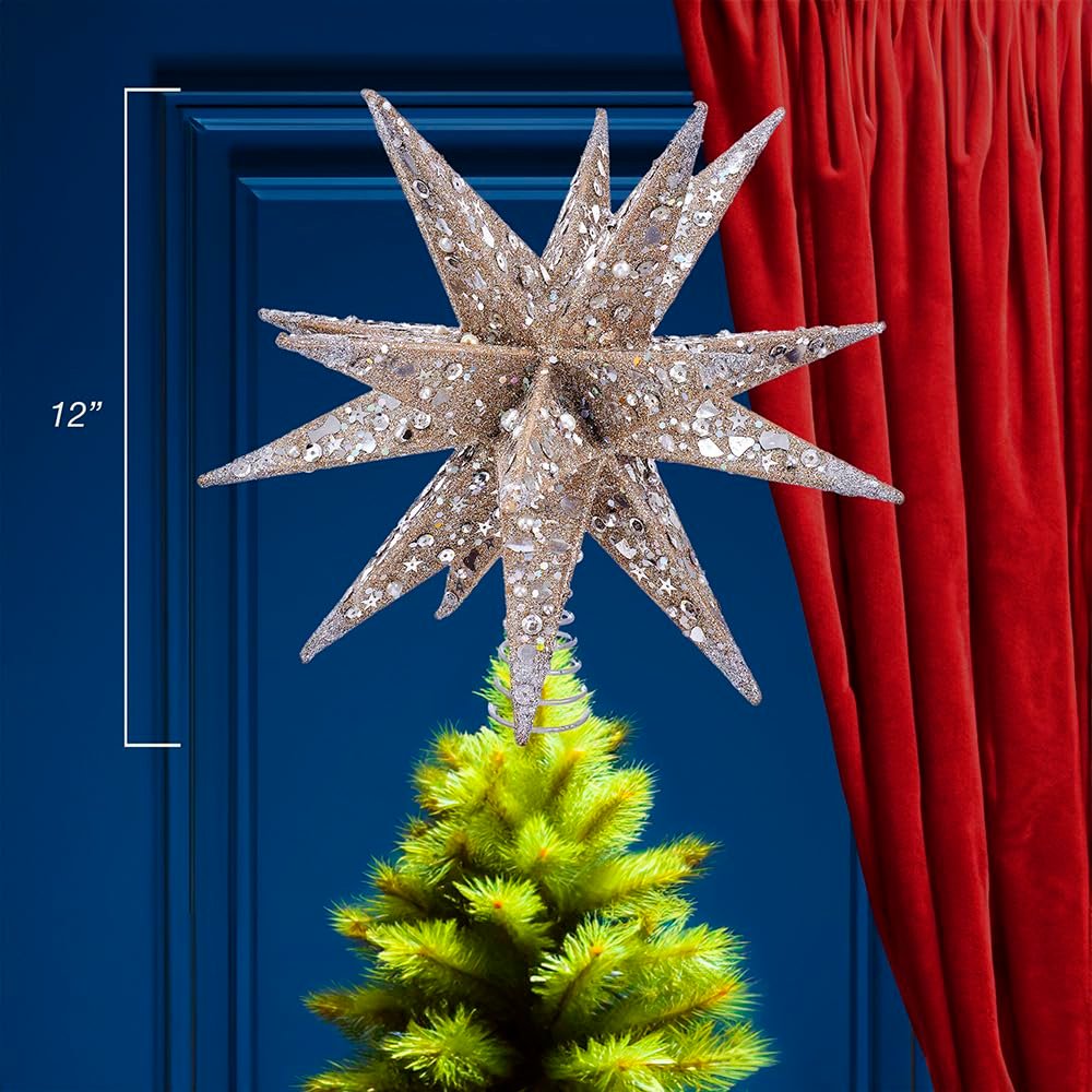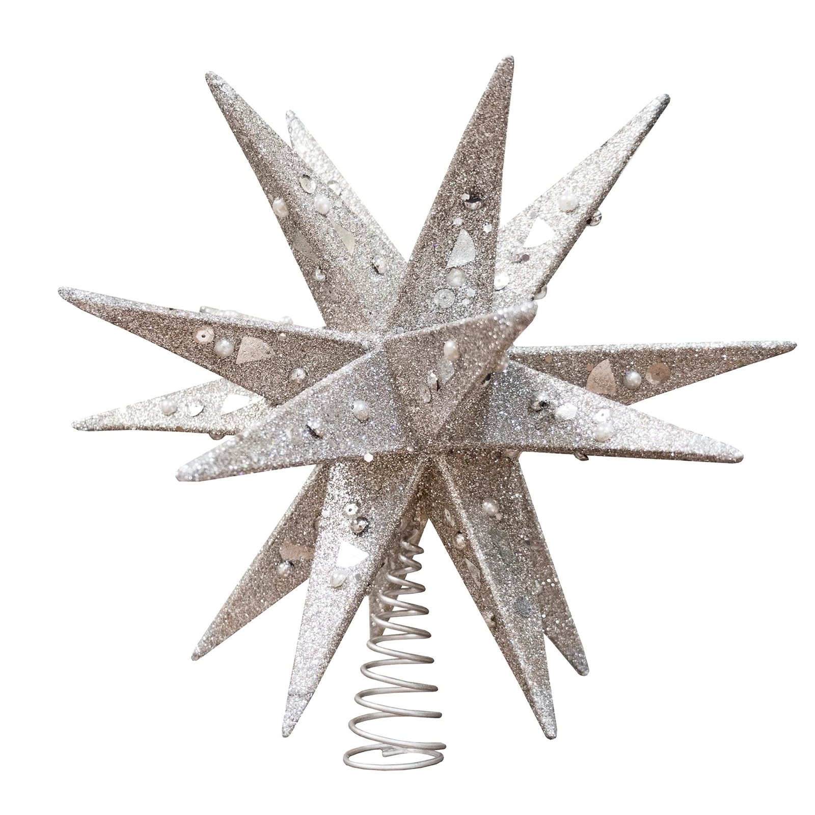 Add the perfect finishing touch to your Christmas tree with this 12-Inch Champagne and Silver Glitter Moravian Star Treetop from Kurt Adler. Its traditional multi-point Moravian star design is unlit and is finished in champagne and silver glitter for an extra festive touch. This treetop looks great from all sides! Made of paper mache pulp, plastic, and metal, this treetop features a beautiful beaded design and attaches to the tree by a metal coil base. Item Size: 12-inches