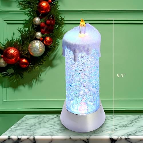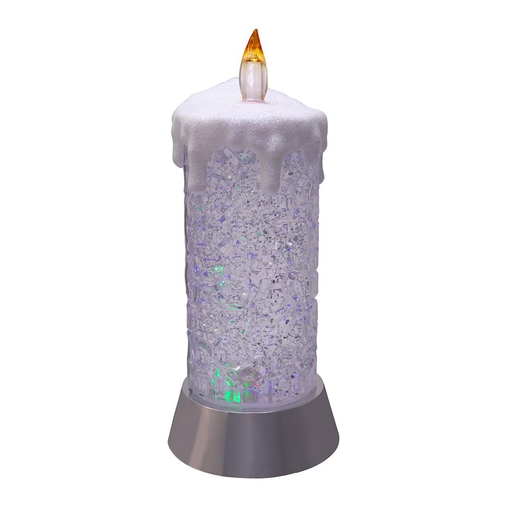 Add a festive touch to your holiday décor with the Battery-Operated Color Changing Snowing Candle from Kurt Adler. This candle showcases a lifelike dripping wax-like design and crystal base. When turned on, the base illuminates while the flame emits a warm amber glow. Requires 1 “AA” battery (not included). 5 warm white lights. Made of plastic, bulb, and iron. Item Size: 9.25 inches