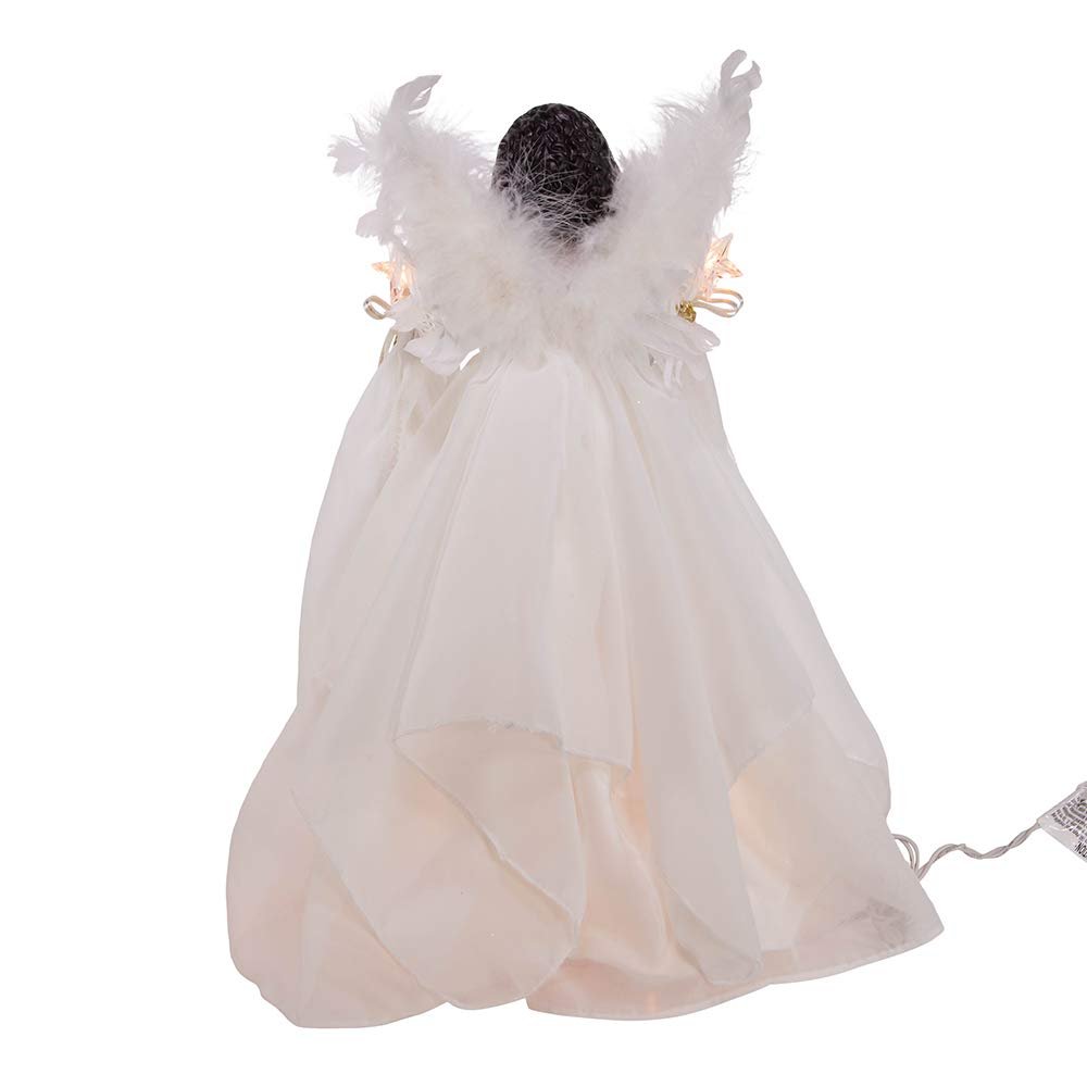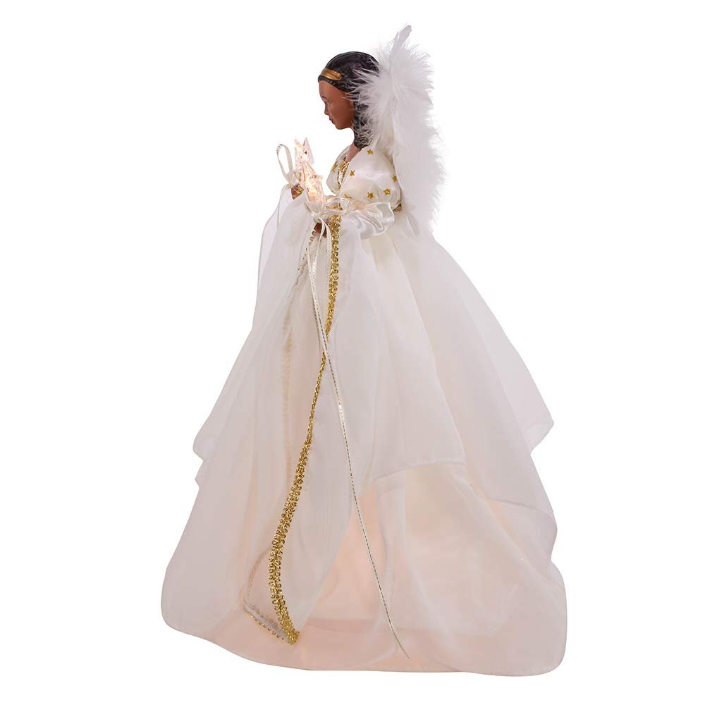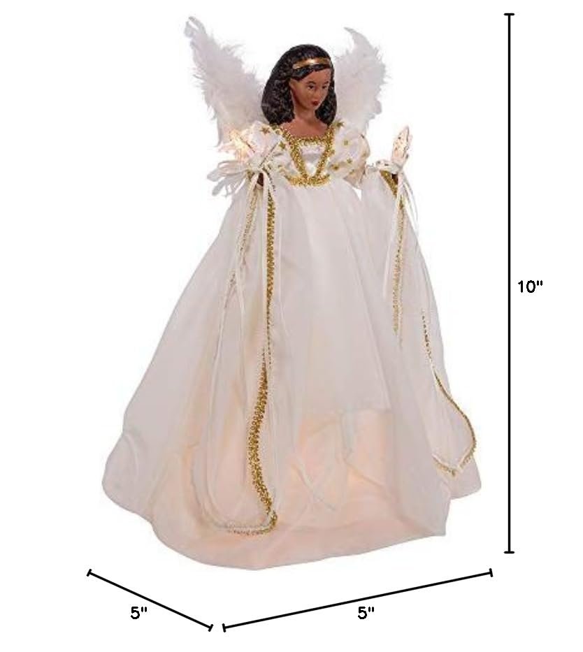 This Kurt Adler UL 10-Light African American Angel Treetop is a festive addition to your holiday decor. The angel wears an elegant ivory and gold gown adorned with ribbons. Her wings resemble traditional feather-like angel wings. Measures 16.5-inches tall. Made of polyester, plastic, porcelain, feather, and PVC