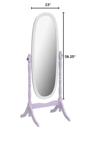 This stylish Oval Cheval Standing Mirror in Purple/White is perfect for your bedroom or dressing area. It features an adjustable tilt, sleek lines, and a swivel feature for customizable use. The freestanding design adds elegance to any space, with solid wood construction ensuring stability. Suitable for young teens and adults, this timeless piece is a must-have for your daily routine. Dimensions: 59.25″ x 23″ x 21″. Materials: Eucalyptus Wood, MDF, Glass Mirror. Minor assembly required.