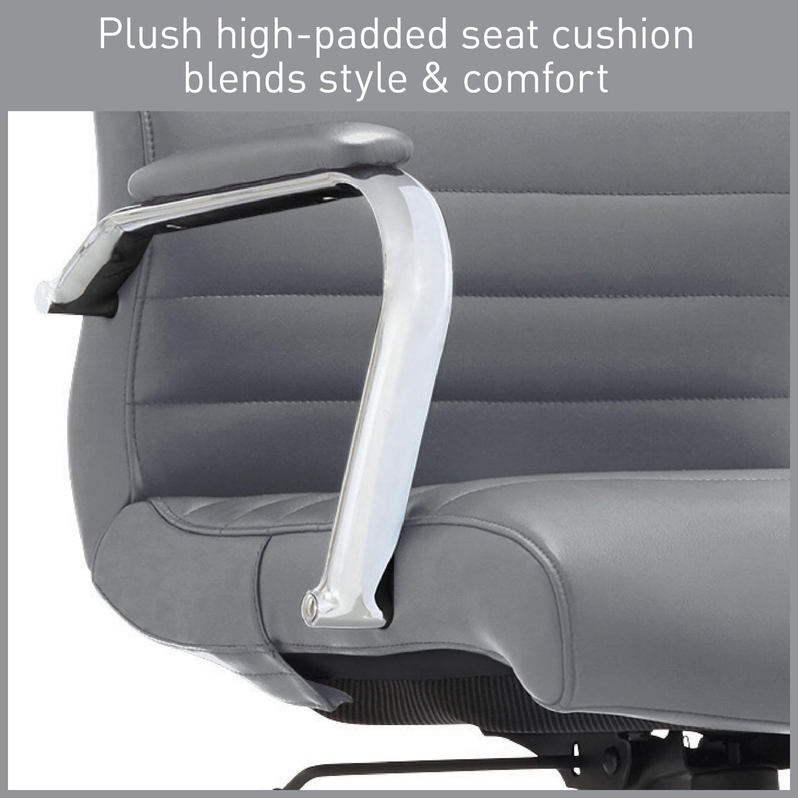 Experience the sleek, chic, and ultra-comfortable Realspace Modern Comfort Chair, the perfect match for your workspace. Designed with luxe bonded leather, chic silver framing, built-in lumbar support, easy seat-height adjustment, plush padding, and a wipe-clean finish. This chair wins the day with style and grace, supporting your lower back for improved posture. ANSI/BIFMA Compliant and exceeds Flammability Standard TB117-2013. Ideal for office or student desk use.