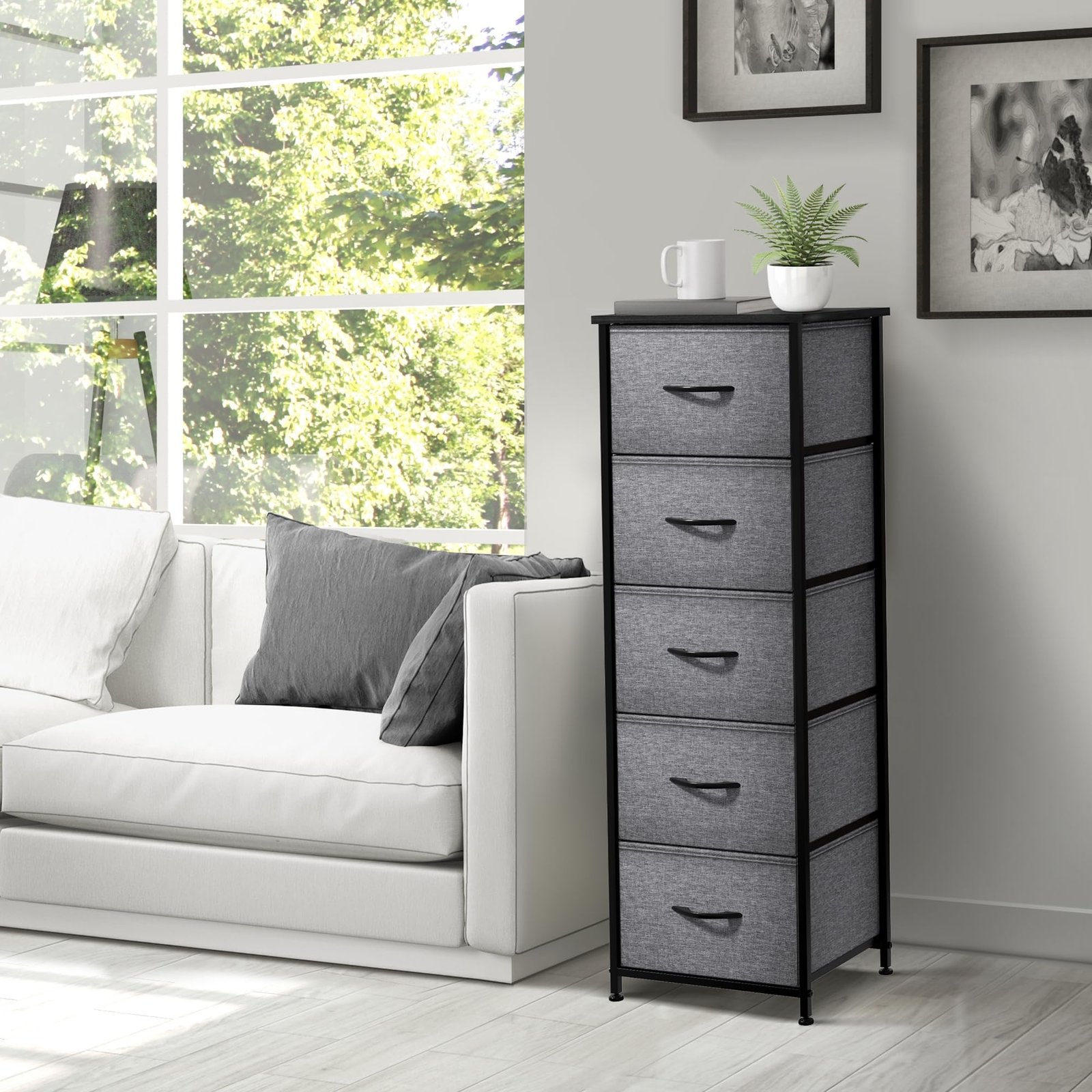 Display or organize household items with the Sorbus 5-Drawer Nightstand. This versatile stand offers ample storage with fabric drawers and a steel frame. Perfect for bedrooms, living rooms, and more. Lightweight and easily portable.