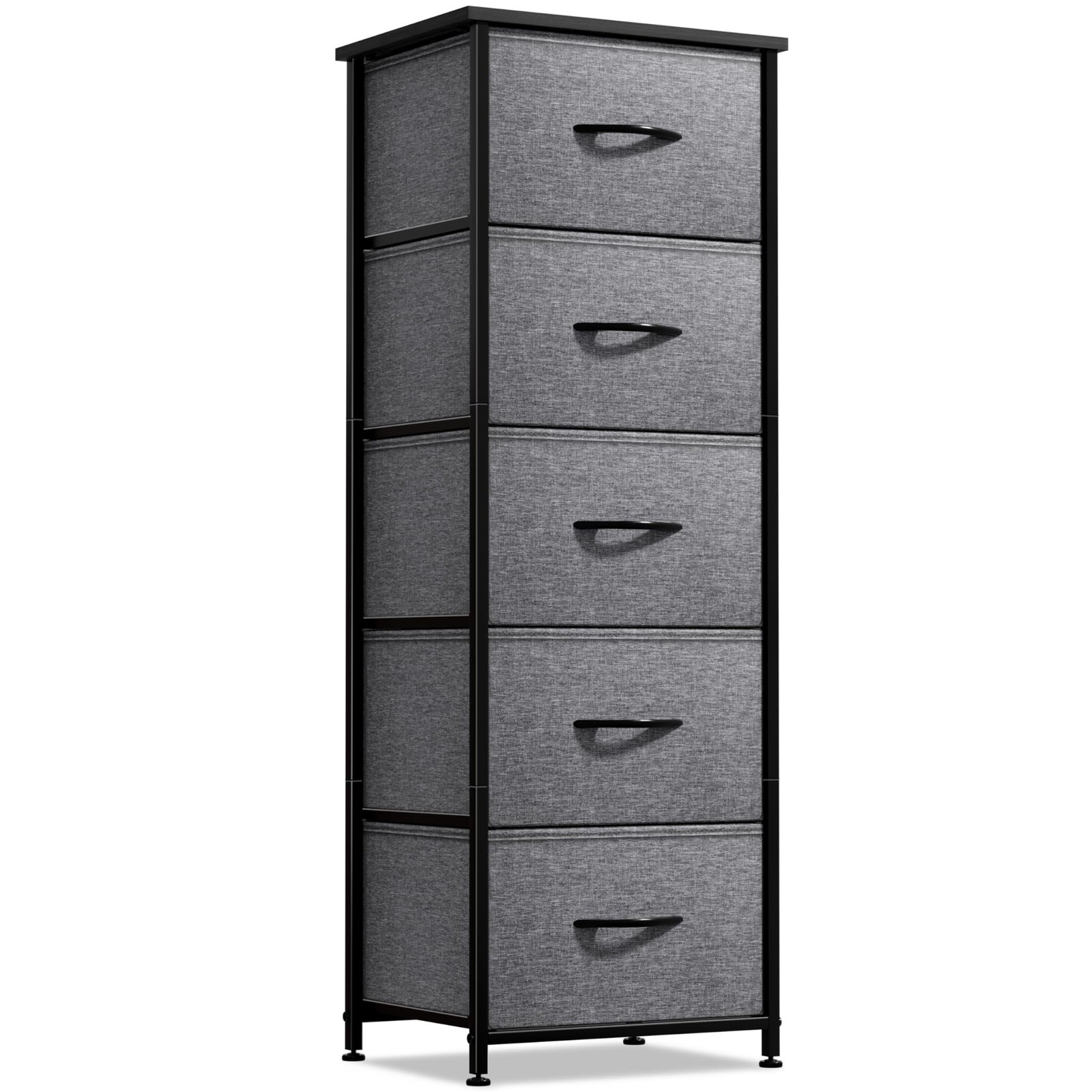 Deep storage capacity, foldable drawers, wood handles for easy access, and a sturdy construction. The neutral charcoal gray color blends seamlessly with any decor style.