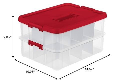 Safely store and organize your Christmas ornaments with the Sterilite 24-Compartment Christmas Ornament Box. This stackable box features see-through, latched layers for easy access. The lid’s handle ensures convenient carrying, and the 24 compartments accommodate ornaments of various sizes. Choose this box for secure post-holiday ornament storage.