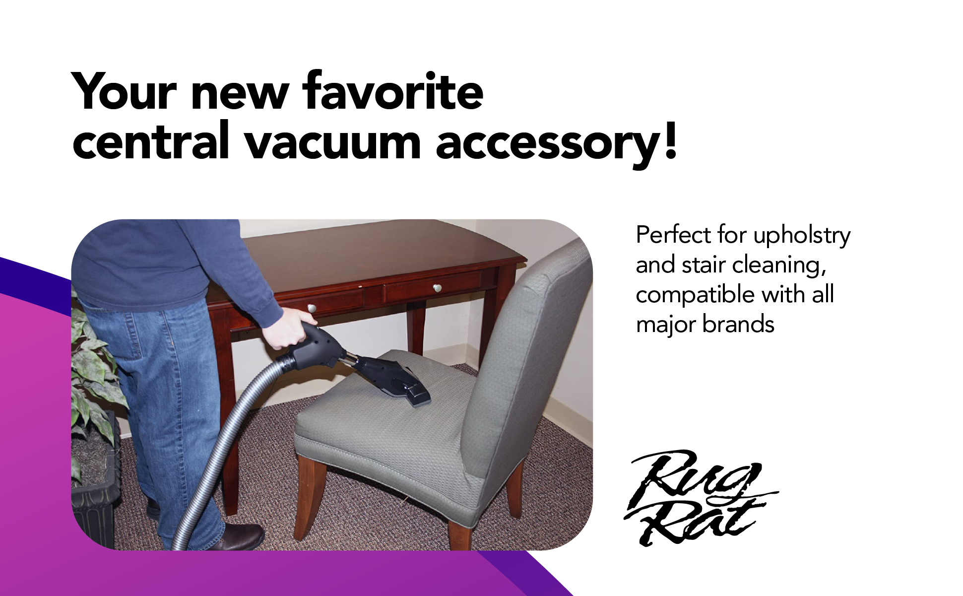 The Rug Rat hand turbine features a 6″ cleaning path and utilizes vacuum-generated air for power. It’s easy to use, quiet, and perfect for stairs and upholstery cleaning. Requires no extra power source, batteries, or cords. Includes reinforced belts and a swivel neck for efficient cleaning.