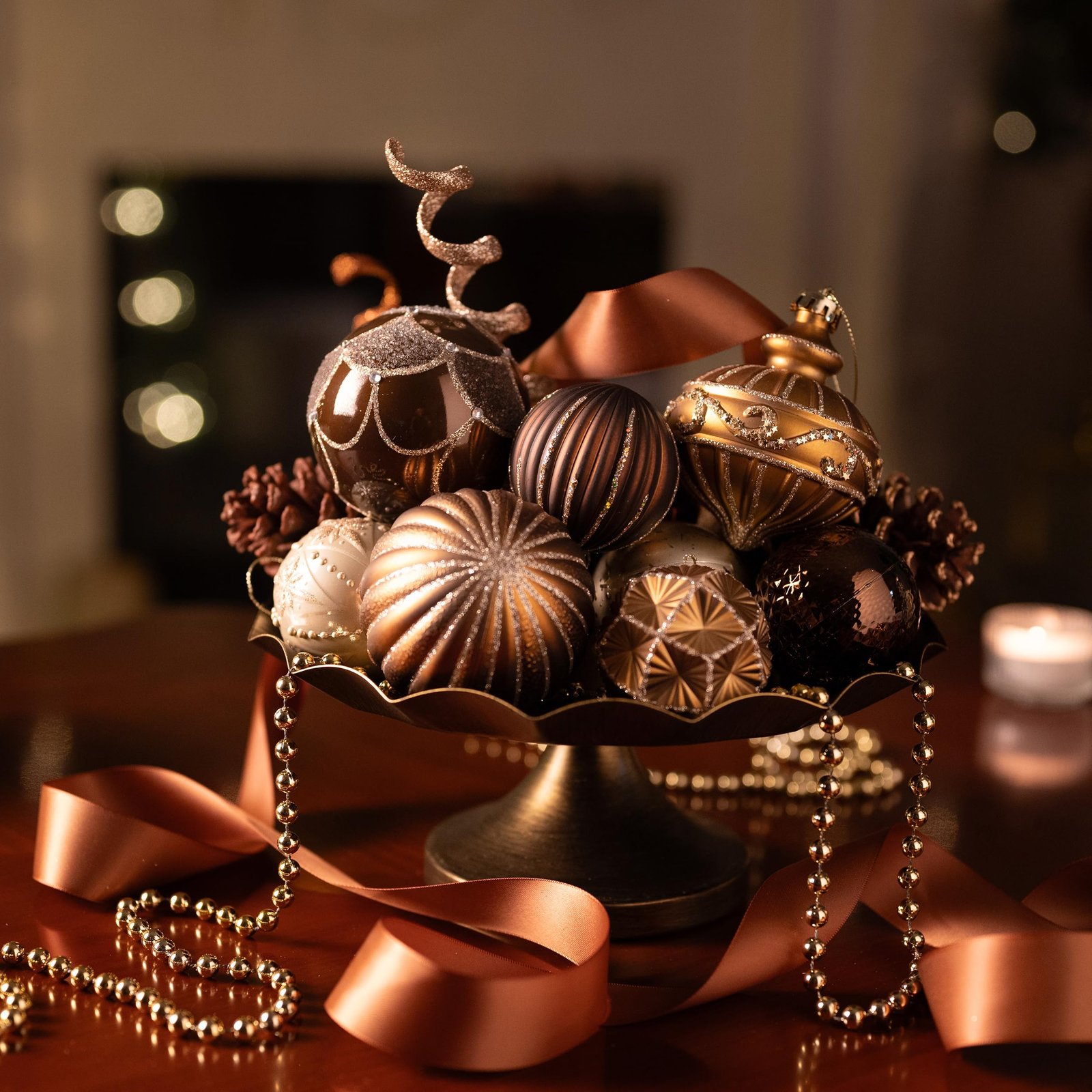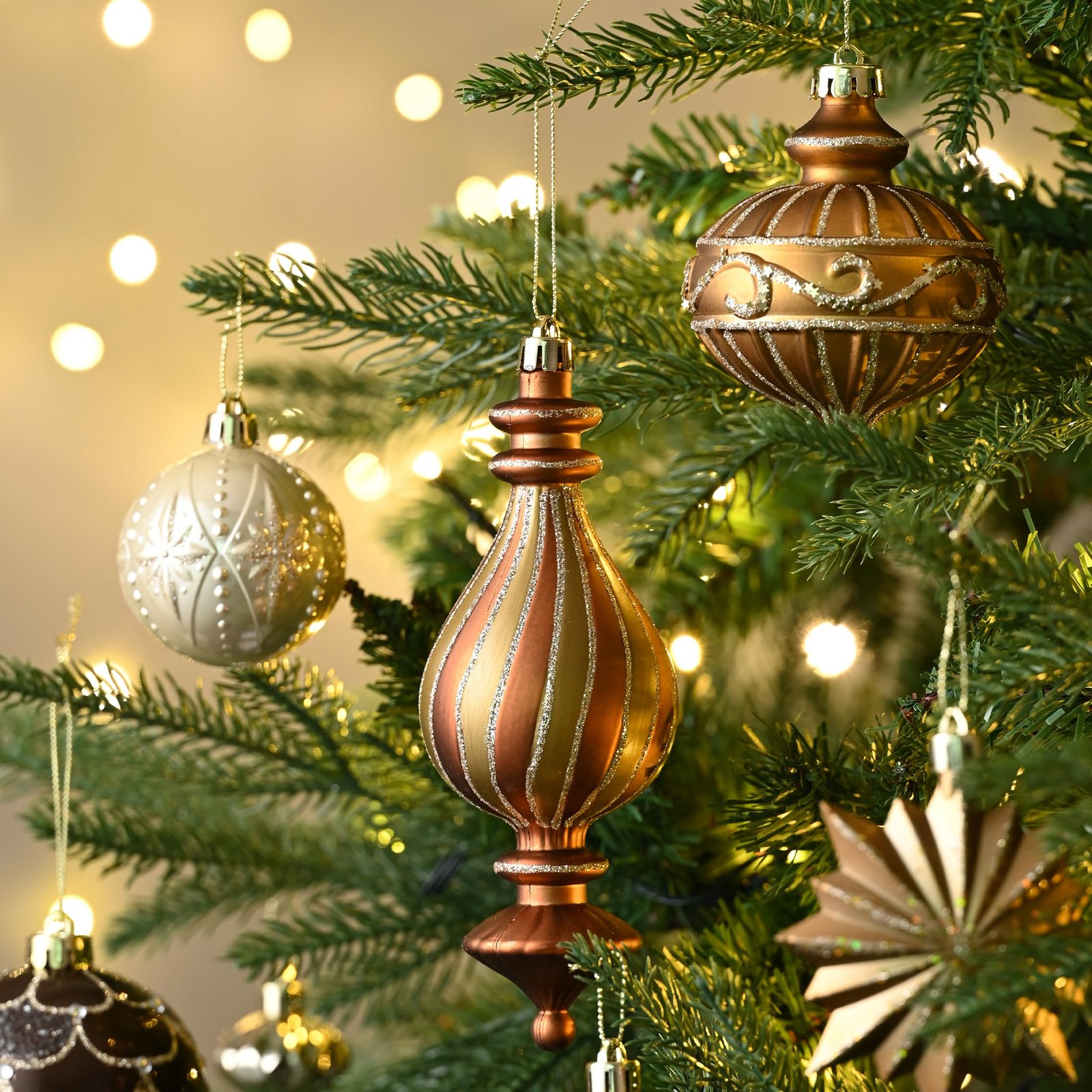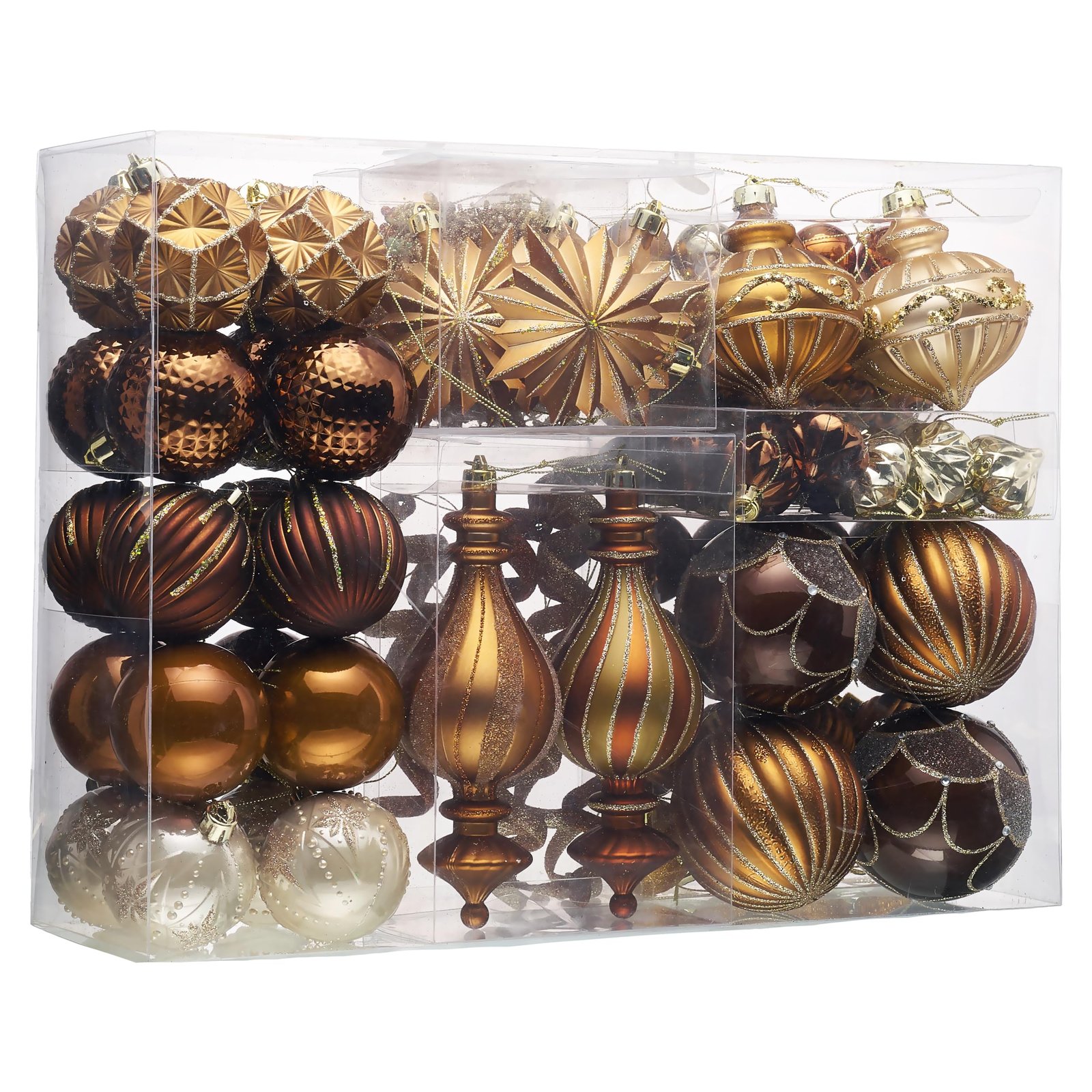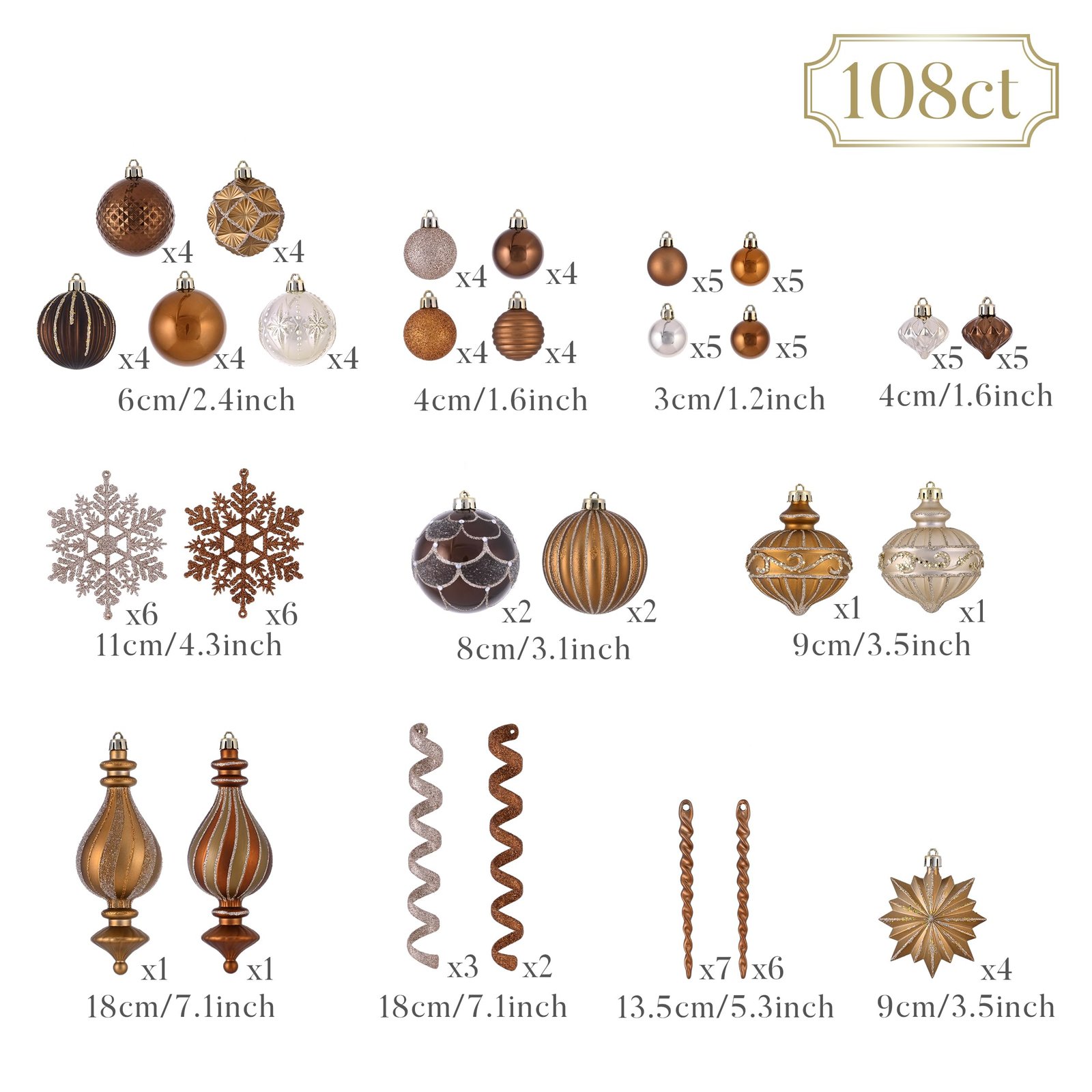 Featuring 108 shatterproof bronze, copper, and gold Christmas tree decorations with firm caps, uniform color, and almost invisible seams.