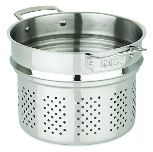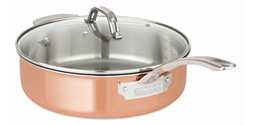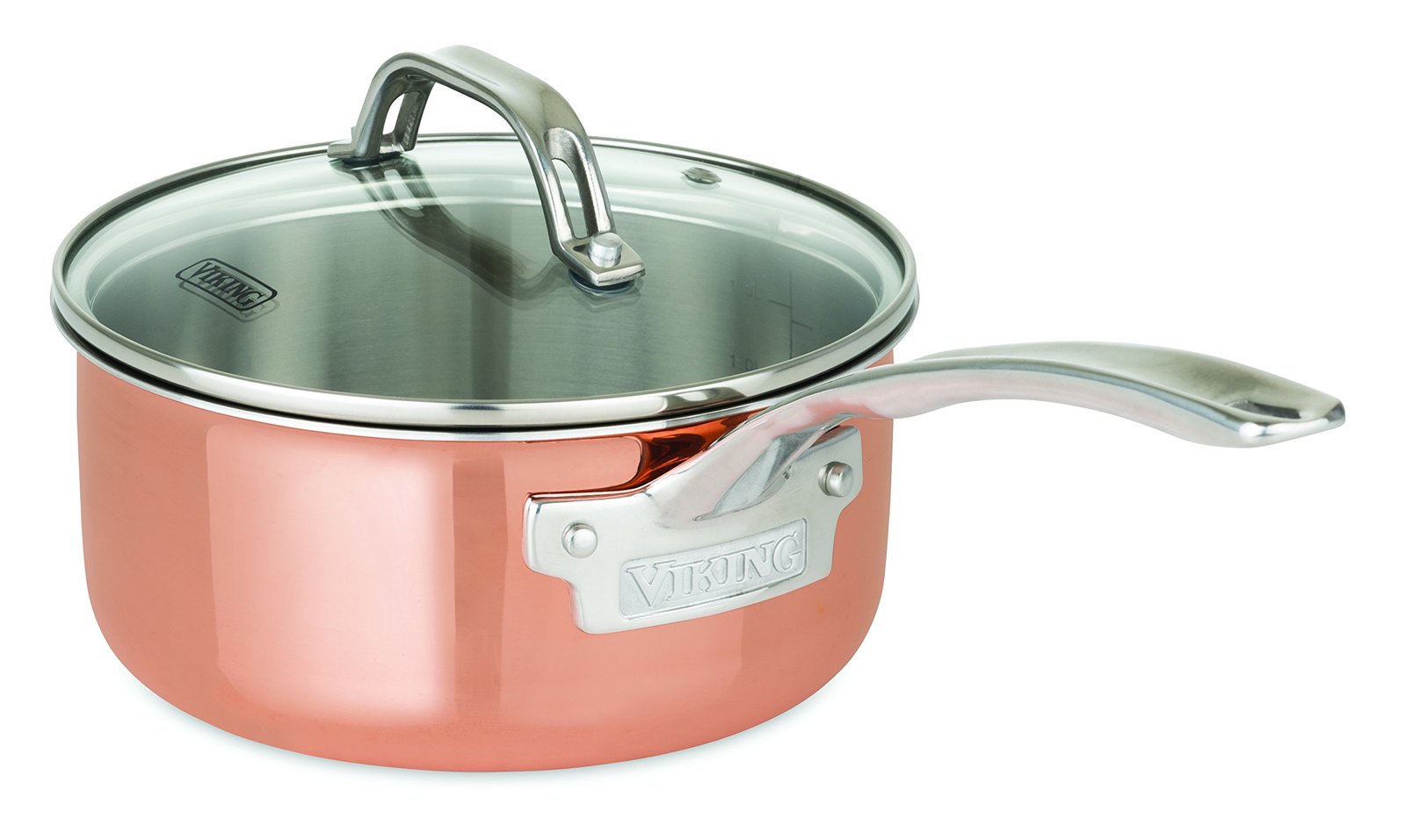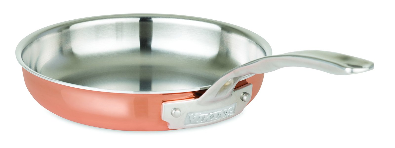 Viking Copper Clad 3-Ply Mirror Cookware combines a layer of aluminum sandwiched between a copper exterior and a heavy-gauge stainless steel interior for superior performance. The aluminum core provides exceptional heat transfer throughout the pans, while the copper exterior heats evenly for precise temperature control. Featuring a flared seamless rim, the vented glass lids allow you to easily see the progress of your meal while reducing the chance of boil-overs. The Viking signature ergonomic stay-cool handles have a finger guide and built-in heat break for easy lifting and control, while the internal volume measurements make measuring quick and precise. Pans are oven safe up to 500°F/260°C (up to 400°F/204°C with glass lid). Set includes: 8 quart stock pot with pasta insert and glass lid, 4 quart soup pot with glass lid, 5. 2 quart sauté pan with glass lid, 2. 25 quart and 3 quart sauce pans with glass lids, 8 inch and 10 inch fry pans. Compatible with all cooking surfaces, except induction.