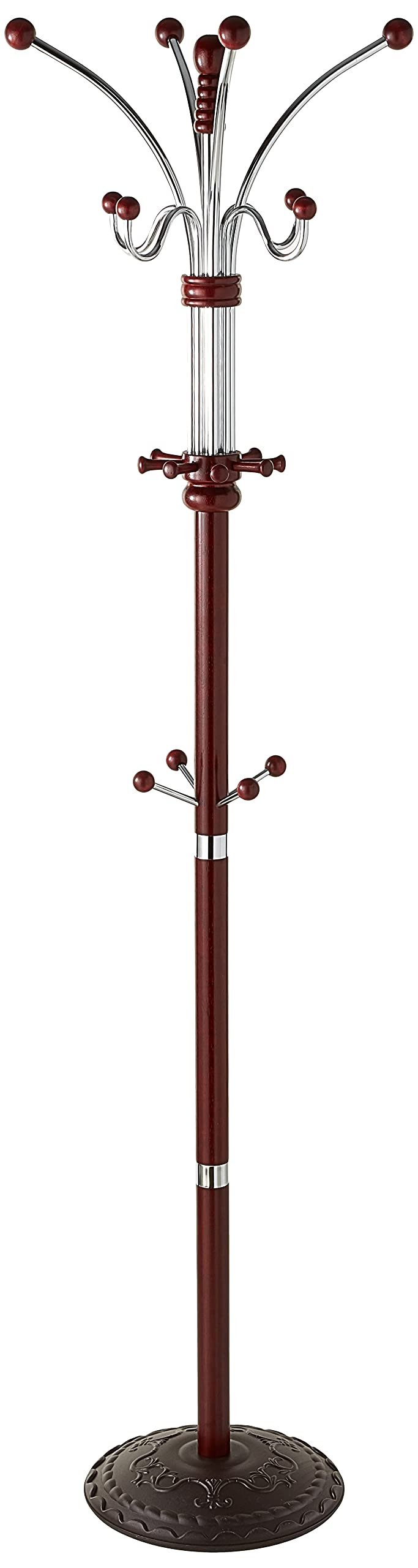 Coat Rack; Ideal for organizing hats and coats elegantly. 12 Chrome & Wood hooks in cherry finish. Assembly Required. Features unique fine moldings and classic turnings.